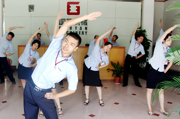 每天早上8:30,隨著公司團支部書記李運喜一聲哨響,健身活動正式開始!全體員工迅速集合,不到兩分鐘,就在健身場地排起了整齊的隊伍,一個個精神抖擻、神采奕奕。體育專業出身的團員青年朱承容,站到隊伍前列給大家當教練。公司高管帶頭參與,大家整齊劃一練起來。“第一節,頭部運動,一二三四五六七八…… “教練”認真,“學員”用心,整個健身場面生動、氣氛活潑、積極向上。