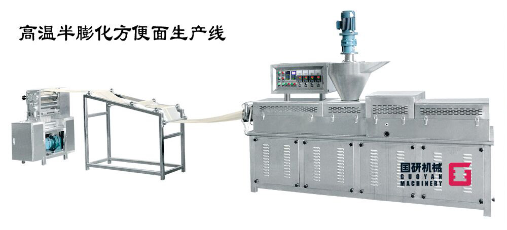 高溫半膨化非油炸方便面生產(chǎn)線,是集自動和面、自動加料、擠壓膨化、面片冷卻輸送、自動切條、分行輸送自動提升、加濕回軟切斷、自動落盒成形、自動干燥到成品輸送入包裝于一體的全自動生產(chǎn)線。該設備主要應用于擠出式非油炸快食面的生產(chǎn),工藝流暢、功能齊全、自動化程度高,機器出品穩(wěn)定,工藝技術強于國內同類生產(chǎn)設備,是油炸方便面廠家更新?lián)Q代的理想選擇。